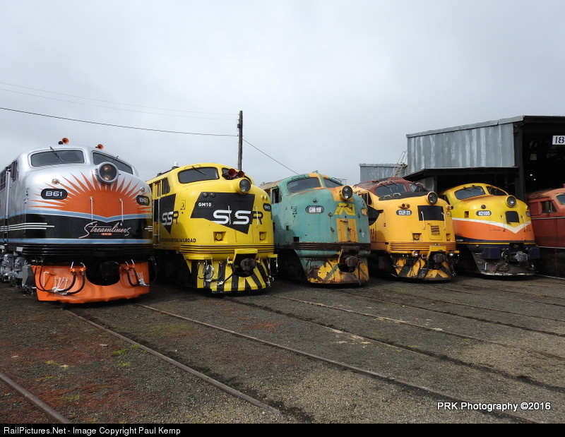 Former Victorian railways Locomotive B61 Shows its special livery along side lcocmotives GM10, GM19, CLP11, 42105. Around the turntable at the Streamliners 2016 event in Goulburn NSW Australia.