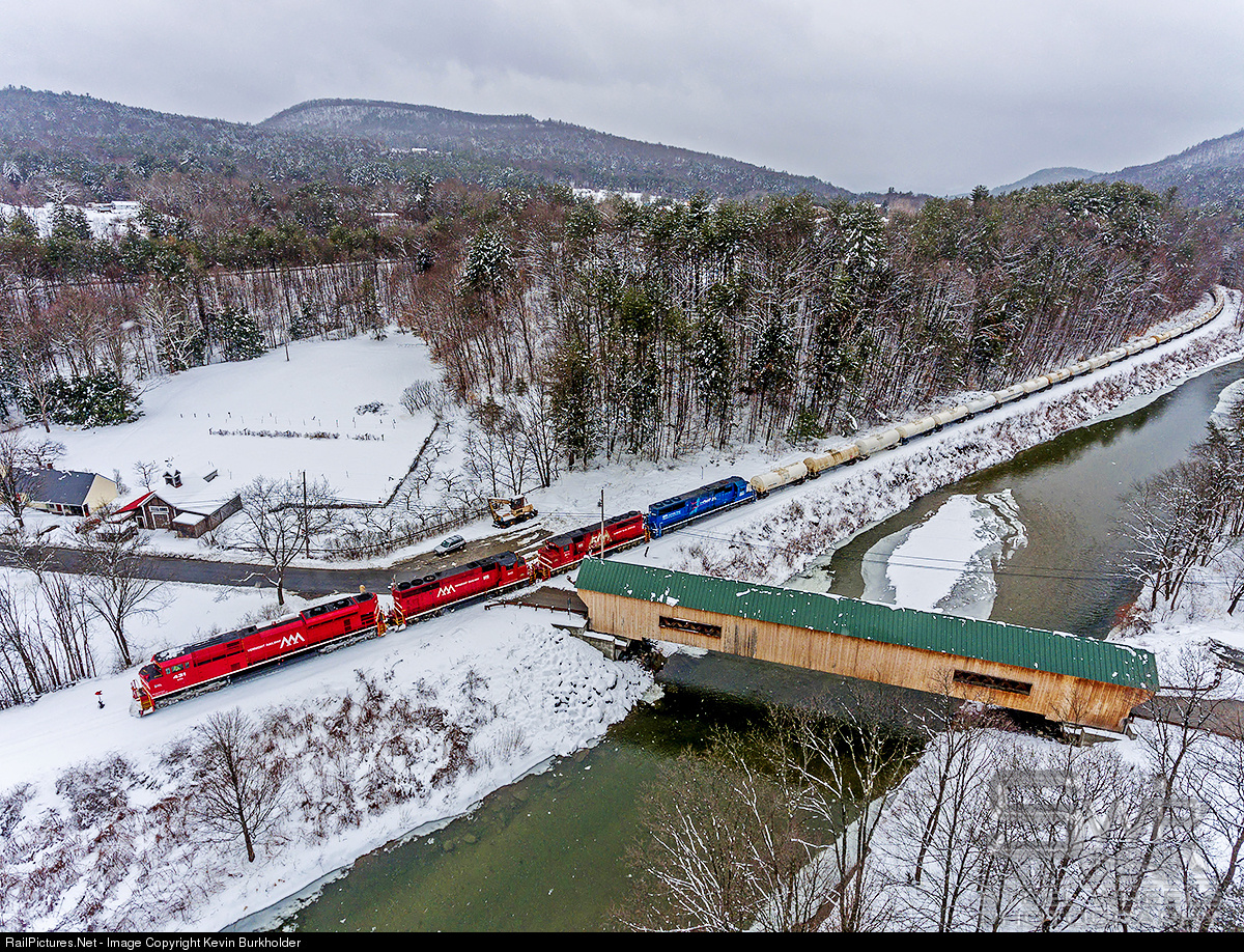 | An April 1 heavy snowfall left a foot or more of the fresh white stuff on the eastern slopes of the Green Mountains. Vermont Rail System train 263x - the Saturday Slurry - is seen passing the Bartonsville Covered bridge, which spans the Williams River and is the 2012 replacement to the previous bridge here that was washed away in Hurricane Irene in 2011. The VRS train is sled by VTR SD70M-2 431, GP40-2Ws 310 and 311, with GMTX special logo/paint SD60 9000 bringing up the rear of the consist. |