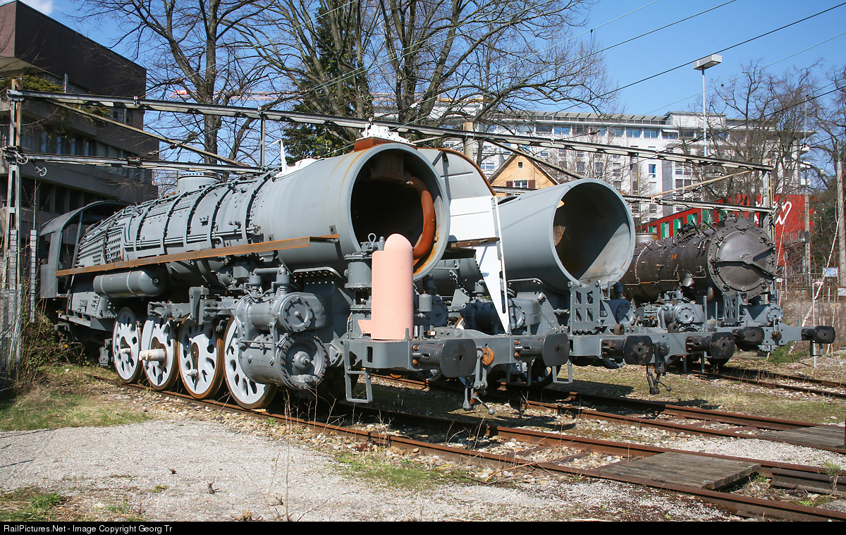 Parts of three american/canadian built 2-8-2 "Mikado" steamlocomotives of the french railway SNCF, stabled in Winterthur, from left 141 R # 1207 (Montreal Locomotive Works 1946), # 73 (Lima 1945) and # 1332 (Canadian Locomotive Company 1947). The locomotives came to Switzerland for restauration, but the project ended with the bankruptcy of the company in charge of their restoration.