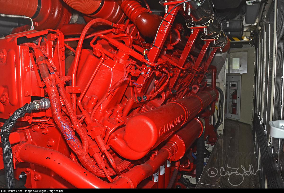 Washington State Department of Transportation 1402, a Siemens SC-44 diesel-electric passenger locomotive, rolled out of the factory 4 days earlier and is deadheading to Colorado (along with WDTX 1403) for testing, and as a result the 4400-horsepower Cummins 16 cylinder QSK95 4-stroke high speed diesel engine is still in pristine condition. As their new owner has not yet accepted these new locomotives, they are traveling temporarily using Siemens' reporting mark SIIX. This diesel engine rides upon cushioned supports, and with no metal-to-metal contact, the locomotive is extremely quiet when operating. (If the diesel engine is replaced, 24 hours must be allowed for the engine to seat properly, or else the Tier 4 after-treatment equipment above it will be too high to allow the locomotive’s roof to be installed.) Photographed on railroad property with permission and full PPE.