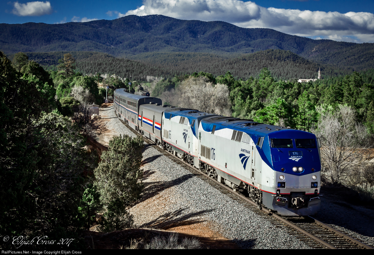 | Moments after reaching the summit of Glorieta Pass; continuing its eastward journey, Amtrak’s Southwest Chief accelerates through the community of Glorieta, NM on this absolutely stunning early April evening. |
