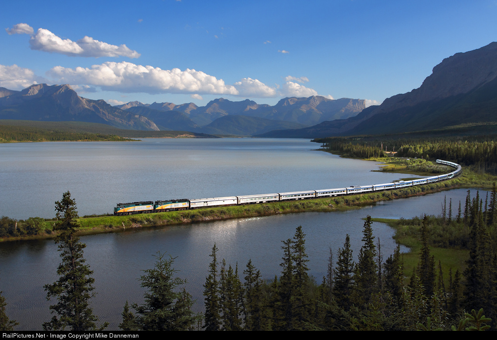 Reflecting the setting sun with stainless steel, VIA Rail’s eastbound Canadian, arcs through “Robertson’s Curve” at Swan Landing, Alberta, on July 9, 2014. The train is skirting Brule Lake and has recently exited scenic Jasper National Park