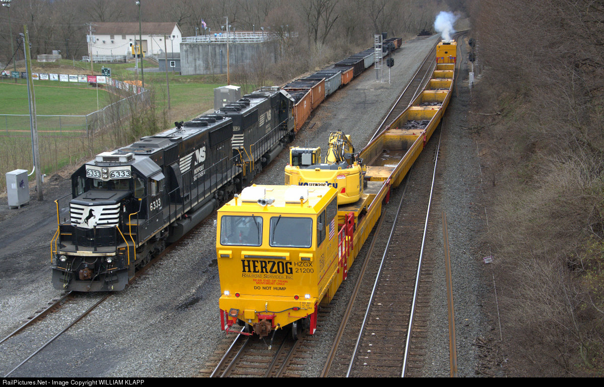 Picking up loaded tie gons with the Herzog tie plate train crossing over to track one.