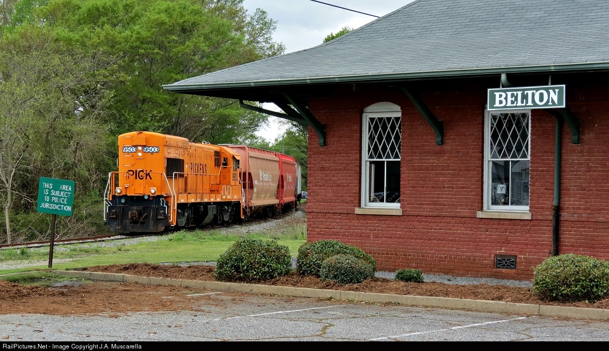 | With the Pickens Railroad's Belton job running on an as needed schedule, shots on this end of the line are much harder to obtain. As luck would have it, the Belton job ran today with a cut of 7 cars for their customers and the Greenville & Western RR. Here they are coming into downtown Belton as they pass the Belton Depot, now home to the South Carolina Tennis Hall of Fame. |