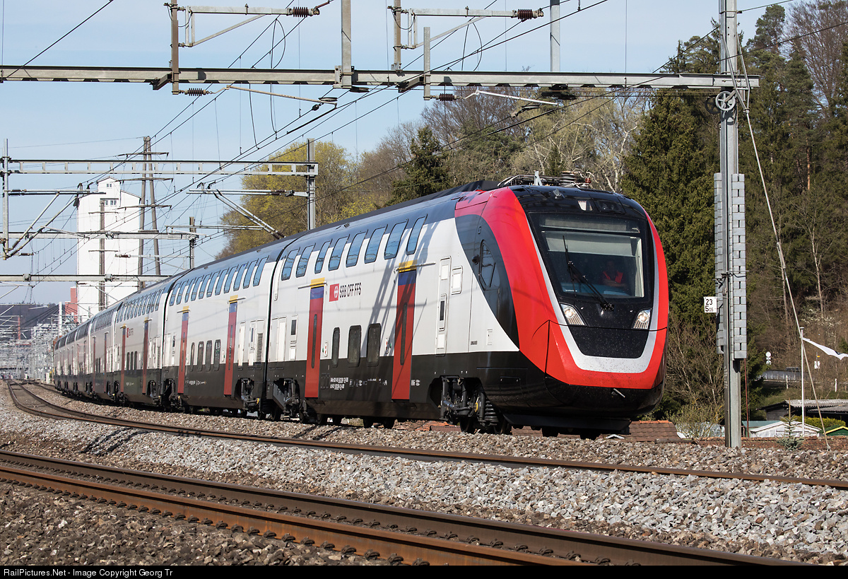 New doubledeck Interregio train "TWINDEXX Swiss Express" or "FV-Dosto" (doubledeck train for long distance) RABe 502 # 208 of Bombardier Transportation for the SBB is on a test run "round the Säntis", leaving Winterthur towards Zürich Mülligen.
