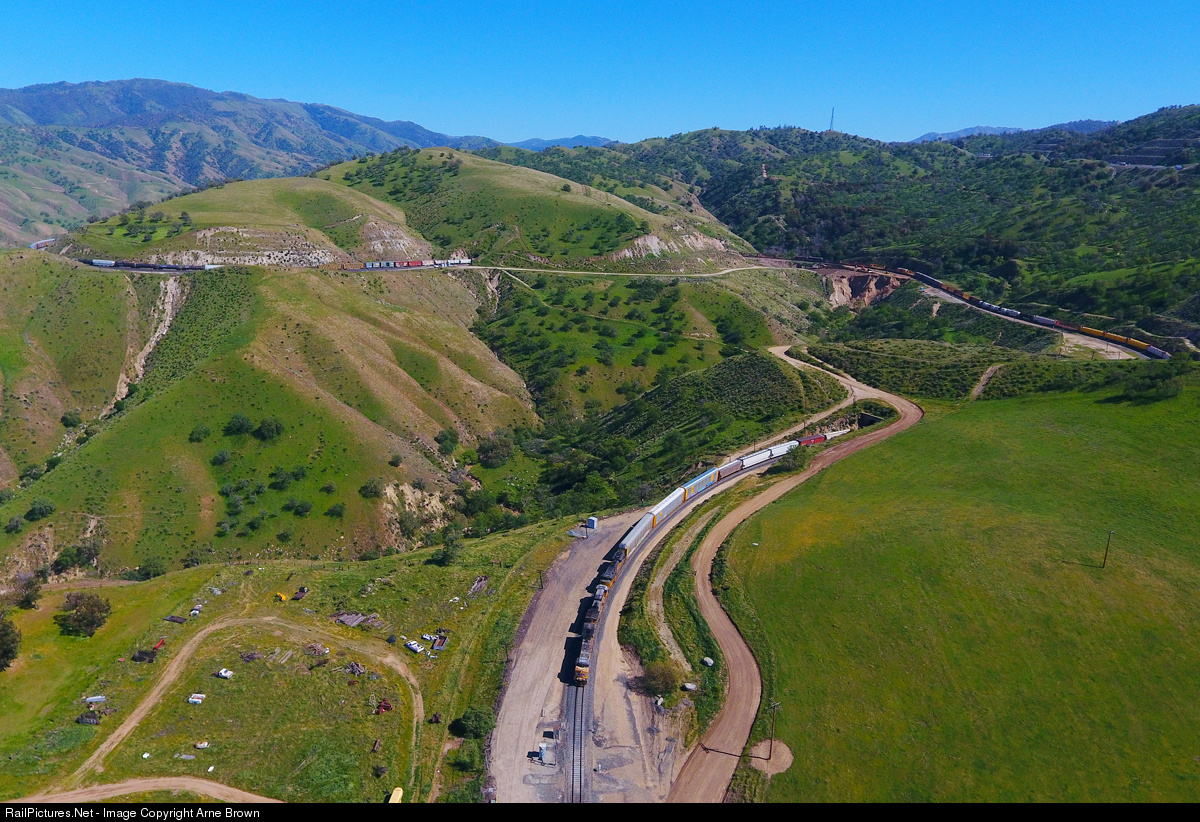 | Sunny day at Bealville as a very long Union Pacific train heads down the hill, it can be seen in tunnels 3 and 5 and around the corner. |