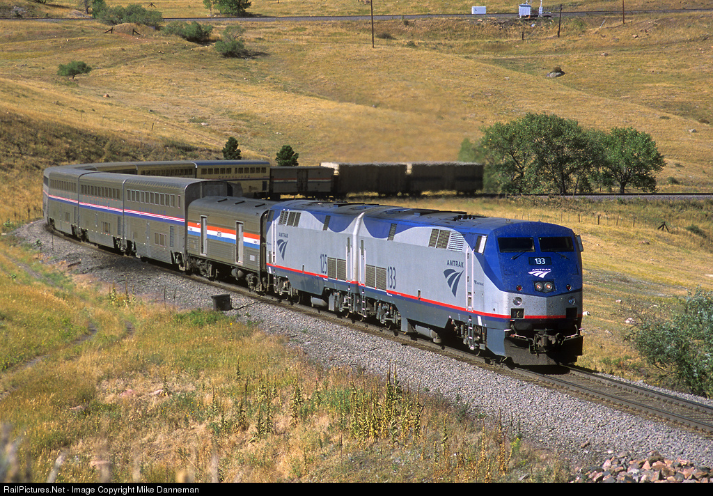 | Amtrak’s California Zephyr is climbing the two percent grade westbound toward Big 10 Curve west of Rocky, Colorado, on September 6, 2001. |