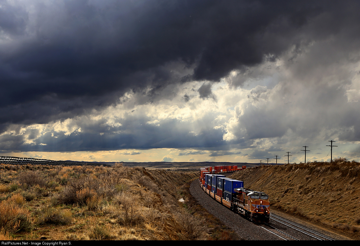 Under a Wyoming sky an eastbound intermodal train drops down from Hadsell and into Rawlins in the heart of Wyoming's 'high desert'.