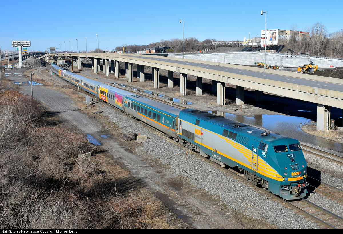 | A long passenger train, with lots of variety. On Sundays VIA 633 always deadhdeads the consist for VIA 47 to Ottawa, leading to a long and interesting passenger train. Here VIA 633 is passing Turcot West with an unknown F40 leading, wrapped VIA 919 mid-train and VIA 917 at the rear. The train has LRC cars in 3 different paint schemes (including a Canada 150 unit and one with a decal commemorating the 100th anniversary of the Battle of Vimy Ridge) as well as two stainless steel cars. |