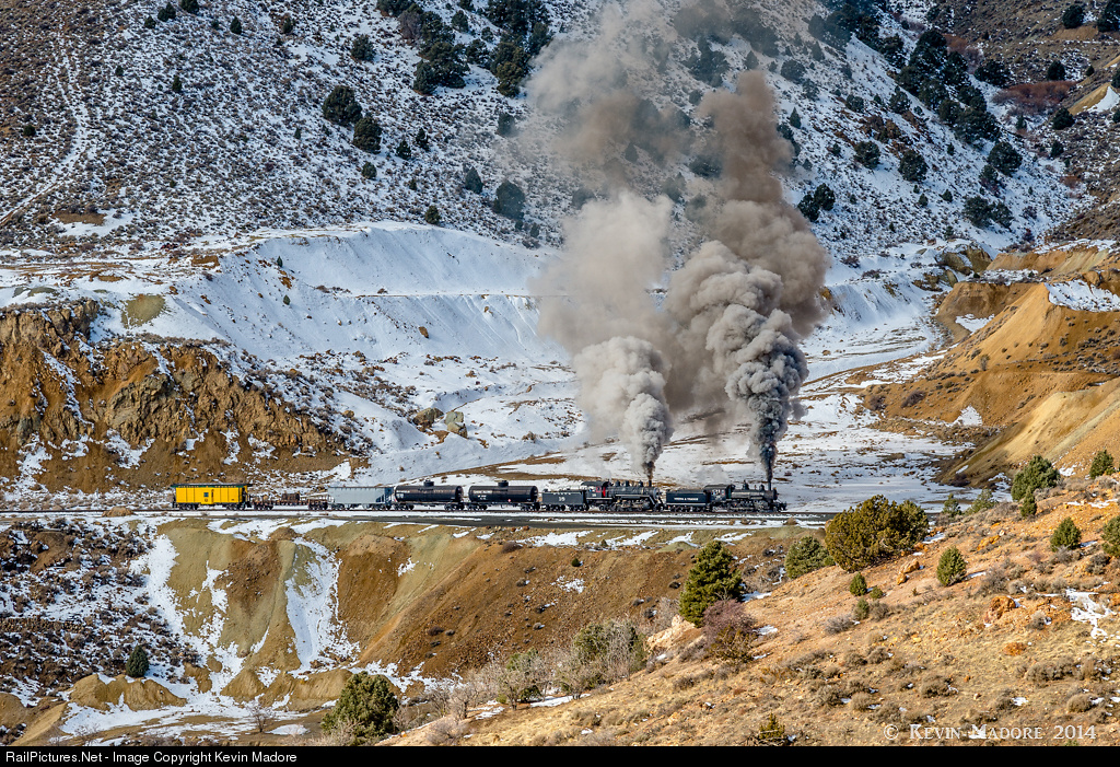 Doubleheader at Crown Point. V&T Locomotives #29 and 18 double-head a short freight of heavy loads past one of the most famous locations on the reconstructed Virginia City Line. You'll note that fill on which the train is running has a different color than the surrounding terrain. That's because the entire fill is built on mine tailings. This is the historic location of the Crown Point Ravine. Before 1935, this entire filled area was a deep ravine, which was spanned by a spectacular, 85 foot-high, 350 foot-long, wooden trestle, known as Crown Point Trestle. This trestle was a signature feature of the railway from 1869 until renewed mining activity in the 1930s led to its removal in 1937 and the creation of the fill you see now. No sooner was the fill completed and the tracks re-installed, when the V&T's business again declined and the rails were completely removed in 1941. Tracks for the present-day Virginia & Truckee tourist line were re-laid in as part of Phase 1 of the Nevada State reconstruction effort in 2005.