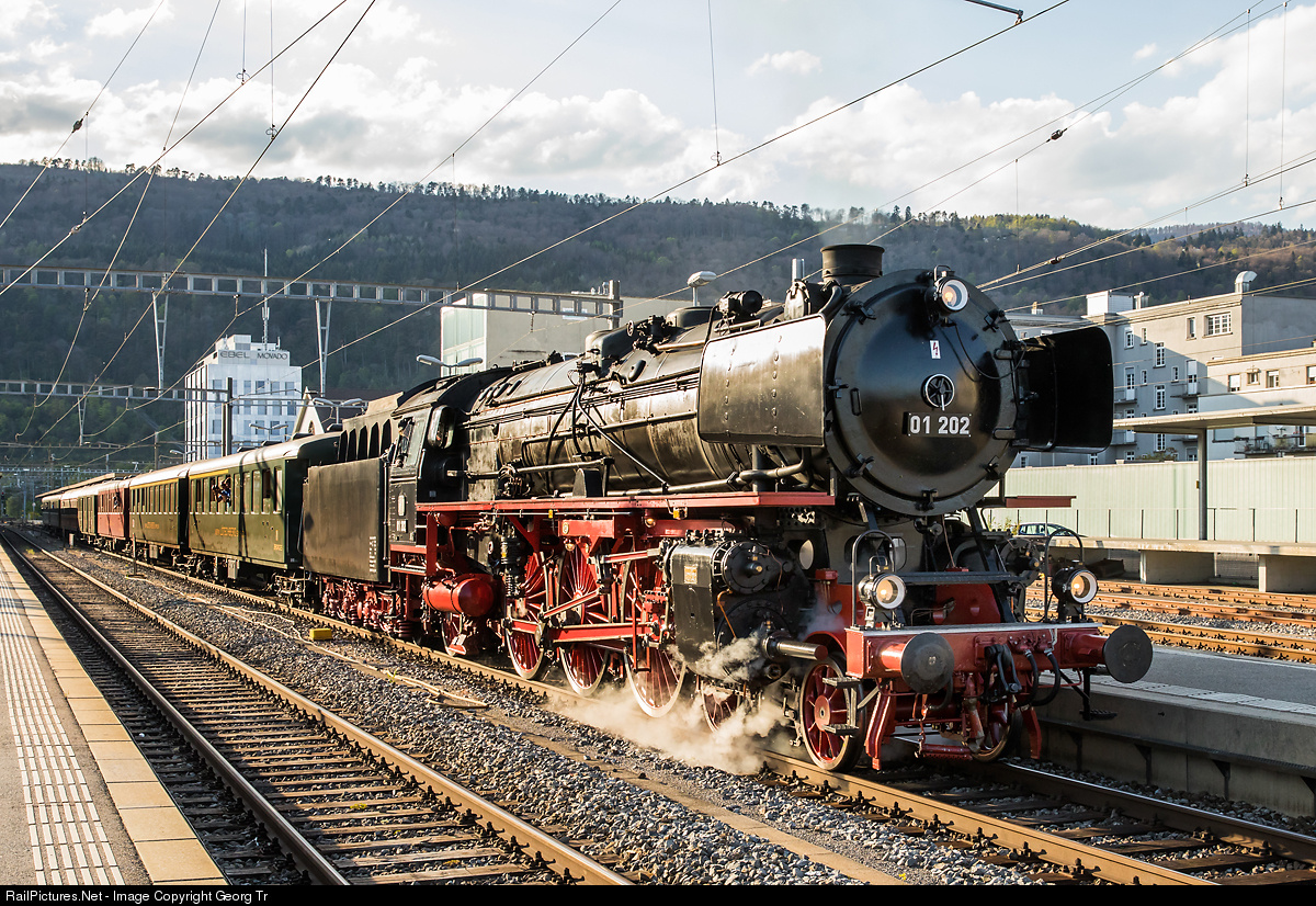 | Former Deutsche Bundesbahn "Pacific" steamlocomotive 01 # 202 is leaving Biel for Lyss with the Zermatt Rail Travel train from Bouveret via St-Maurice-Rivaz-Lausanne-Neuchâtel. |