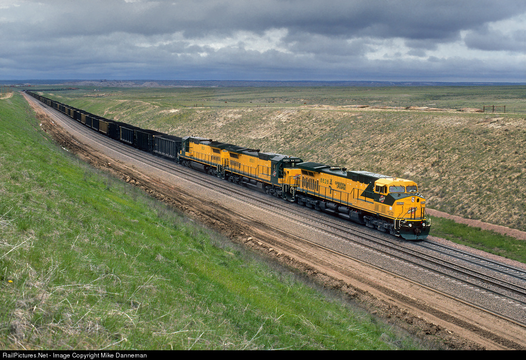 Heading south up Logan Hill, a loaded Chicago & North Western coal train heads for Bill, Wyoming, on May 12, 1995. Powering the heavy train of Powder River Basin coal is C&NW GE AC4400CW No. 8828 and two C40-8s.