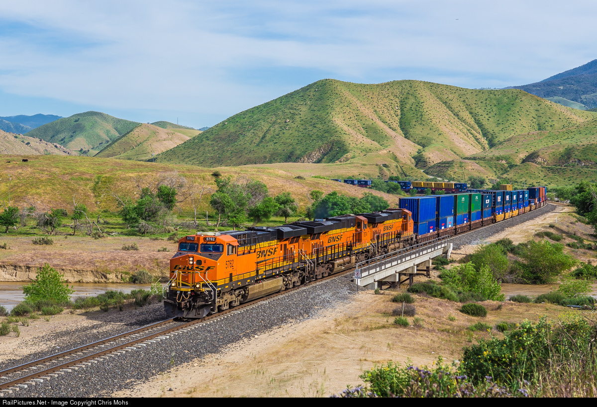 Now free of the grades and curves of the Tehachapi Mountains, a northbound BNSF Z rolls downhill out of Ilmon block and over Caliente Creek for the fast run to Bakersfield. The hills are still green at the lower and drier altitudes from this Winters Rains.