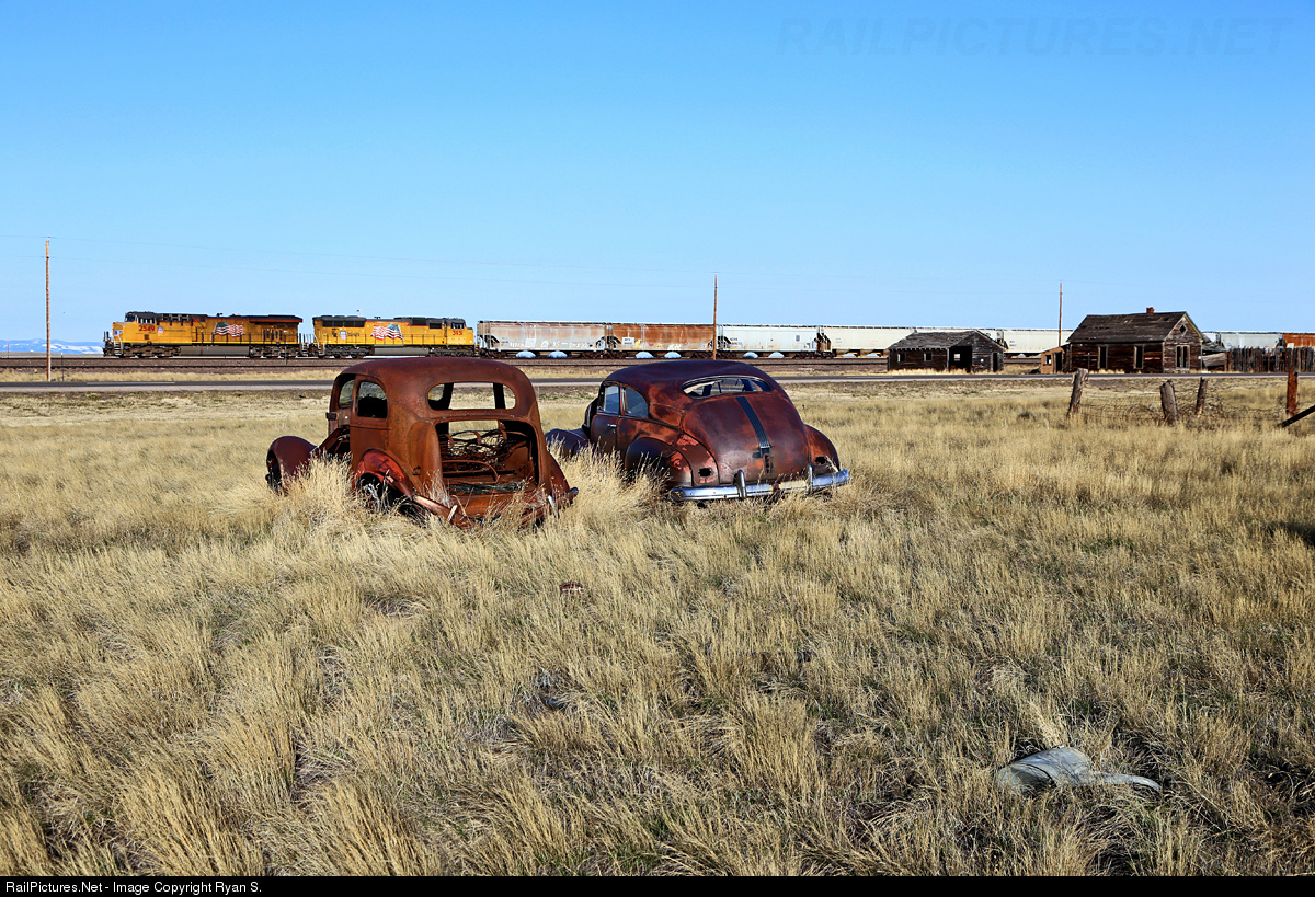 | A pair of vintage American automobiles quietly observe the passage of a eastbound unit soda ash train as it sails through the ghostly remains of Bosler, WY. |