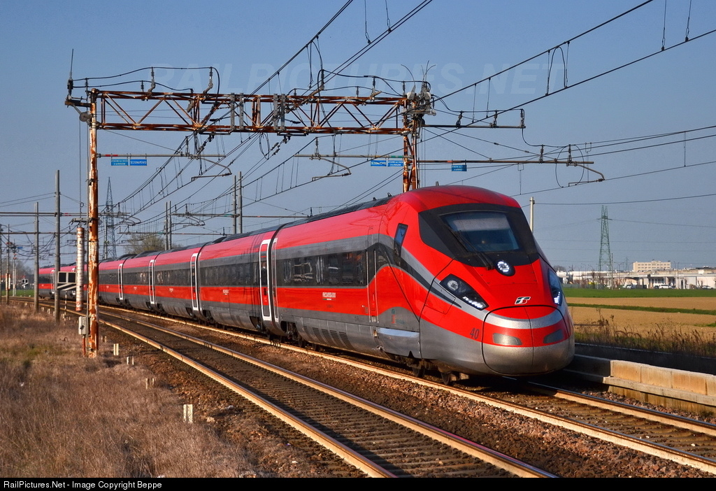 In the picture the ETR-1000-40 left Venice, passes in the late afternoon at a station on the outskirts of Bologna.