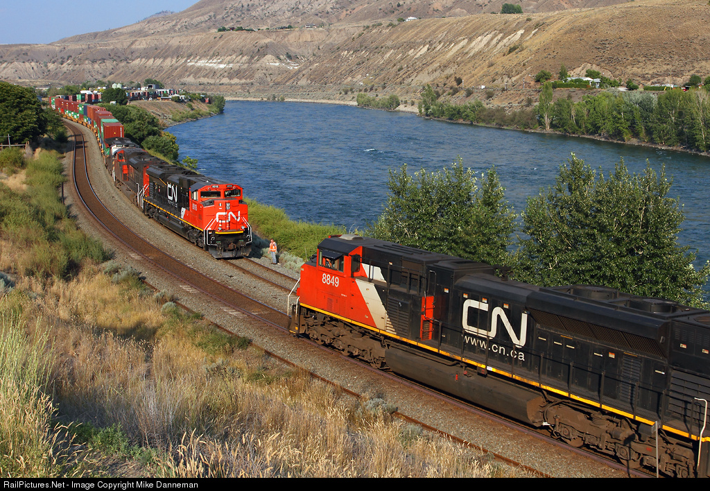 Canadian National intermodal train Nos. 101 and 102 meet at Ashcroft, British Columbia, on a hot July 15, 2014. No. 101 is led by EMD SD70M-2 No. 8918 and is in the siding with the crew on the ground inspecting No. 102, led by sister SD70M-2 No. 8849 passing by on the main.