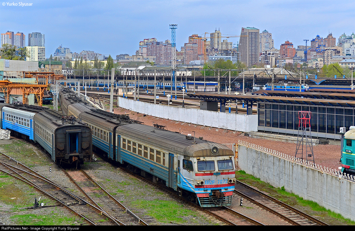 | EMU ER2R-7072 on tyritorry Kyiv Electric Car Repair Plant (KEVRZ).In Kyiv electric trains DC not often can see only on teritorry this plant or it moved to repair or back in their native depot. In Kyiv railway electrified of AC. This EMU set ER2R-7027 built in April, 1987 by plant Rīgas vagonbūves rūpnīca (RVR) and was registered in depot RPCH-1 Kharkiv (Pidvenna zaliznytsya / Southern railway). |