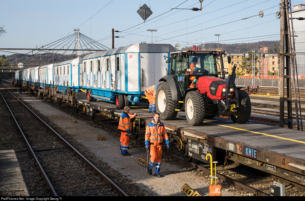 Unloading of KNIE circus trailers (personnel carrier) from SBB flat cars of Kps type in Winterthur freight yard. The KNIE circus is moving from town to town over night using two chartered trains of the SBB and came from Buchs (SG) over last night.