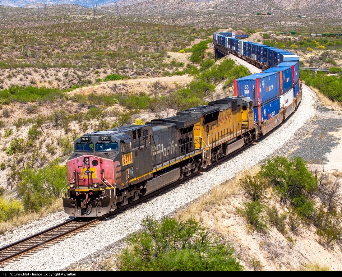 | UP 6318 a patch Southern Pacific unit leads a San Antonio, TX to LATC, CA Z train over Cienaga Creek |
