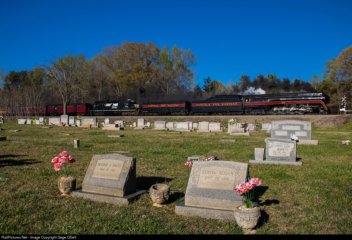 Norfolk & Western 611 leads the southbound Virginian through a small cemetery on the south side of Reidsville, NC