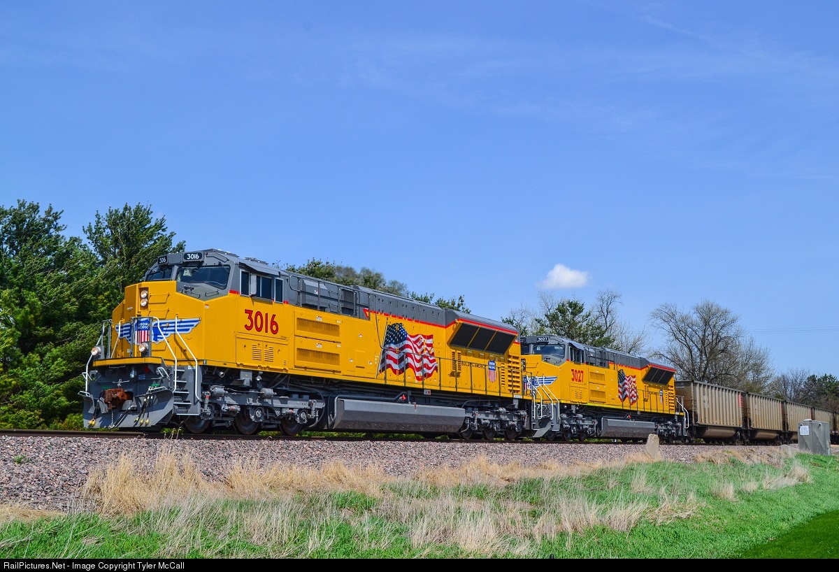 | Union Pacific's new tier 4 SD70AHs lead a westbound coal train along the UP Geneva Subdivision. This is the first time the new tier 4 SD70ACes (non-demonstrator) have ran this section of the UP system. Different features include the teardrop windows, K5LA horn, and a backwards facing horn for southern style operations. Very nice looking engines! |