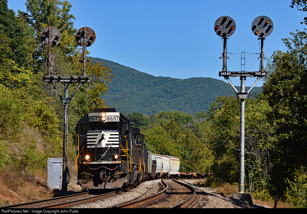 | Freight train 189 splits the N&W CPL's at Blue Ridge as it heads west for a crew change at Roanoke on a beautiful morning in Virginia. Earlier this week the signals were replaced due to PTC upgrades for Amtrak service coming to Roanoke later this year. |