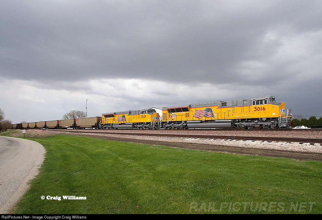 This coal train is sporting some of the latest new UP power in the form of an EMD SD70ACe-T4. 3 of them are in a 2x1 DP setup as this roll this empty westbound from Waukegan, WI, towards Black Thunder Mine, WY. The train is seen here under stormy skies passing thru Stanwood, about 51 miles west of Clinton.