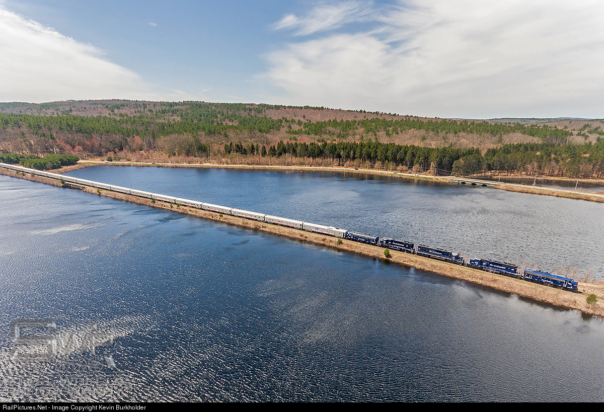 Pan Am knows how to take the Ringling Brothers Circus Train out in style! On April 17 (for my birthday ;-) ) Pan Am Railways operated the last northbound Ringling Bros. train from Worcester, MA to Manchester, NH with an EMD delight consist of FP9A PAR-1, SD40-2 (SD40 carbody) 608, SD40-2 (SD45-2 carbody), GP40-2W 503 and FP9A PAR-2. The train is seen northbound on the causeway between the Quinapoxet and Thomas Basins of the Wachuesetts Reservoir.