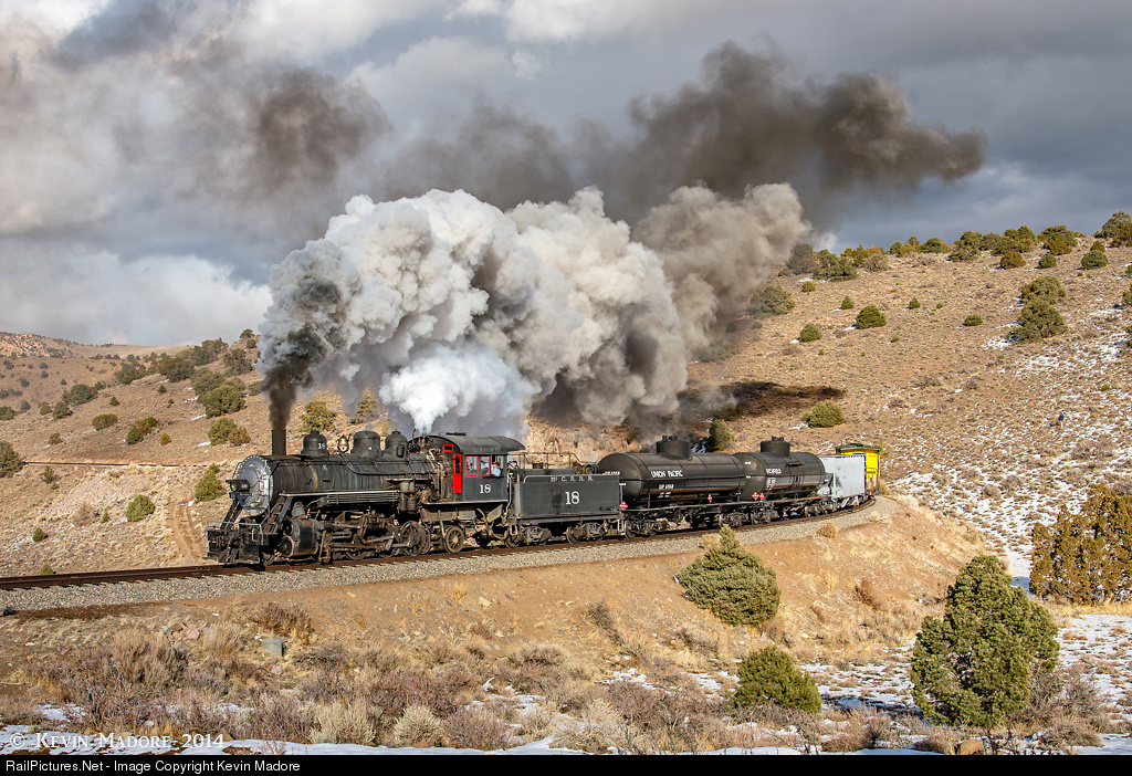 Comstock: MP 46.6. A V&T Freight traverses the wide, sweeping horseshoe curve at American Flat on a chilly winter afternoon, en route to its destination at Virginia City, roughly 5 rail miles ahead. Although this rather barren location is now simply called "American Flat", back in the 1920s, there was actually a mining town just north of here, in the valley below. Known as "Comstock", the town existed to support a massive gold and silver ore processing plant owned by United Comstock Mines Company. Completed in 1922, this plant was the largest such facility in the entire US, handling 3,000 tons of ore per day. Less than 10 years after the plant was built however, the depression hit and the price of silver plummeted. With the business suddenly no longer profitable, the massive mill quickly shut down and was abandoned. Although most of the machinery was sold off, the structures themselves were left in place. The ruins remain, even today, fenced off to keep curious visitors from entering the still dangerous grounds.