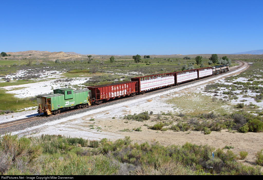 BNSF’s Cody local passes through Garland, Wyoming, on June 24, 2016. The four-car train is led by a pair of former Burlington Northern EMD SD70MACs and trailed by BN caboose No. 12540, and is headed for the junction with the Casper Subdivision main line at Frannie.