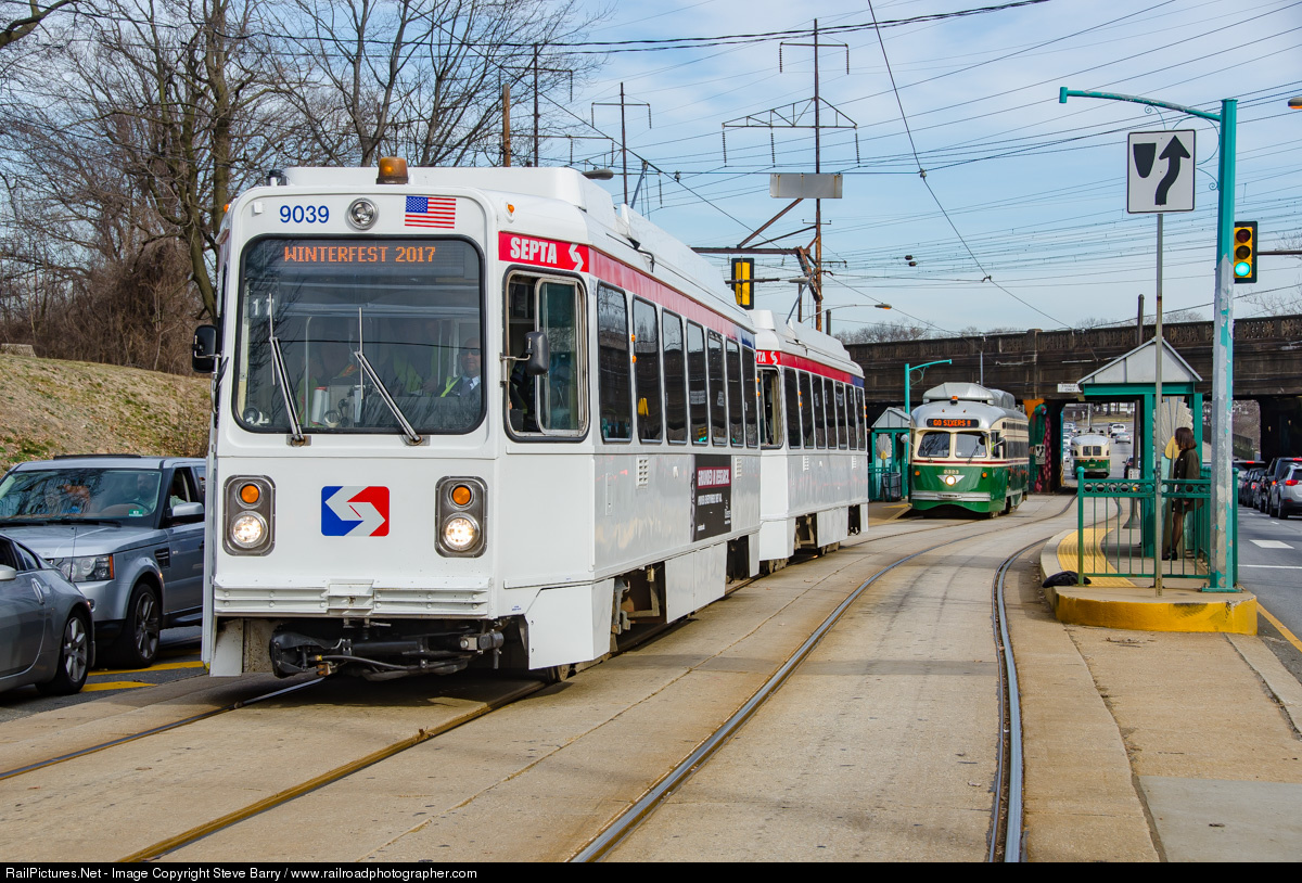 | A two-car Kawasaki charter hosted by the Friends of Philadelphia Trolleys gets caught up in traffic at the Philadelphia Zoo (the zoo seems to have spilled out on Girard Avenue!) as a regular service PCC-2 catches up from behind. |