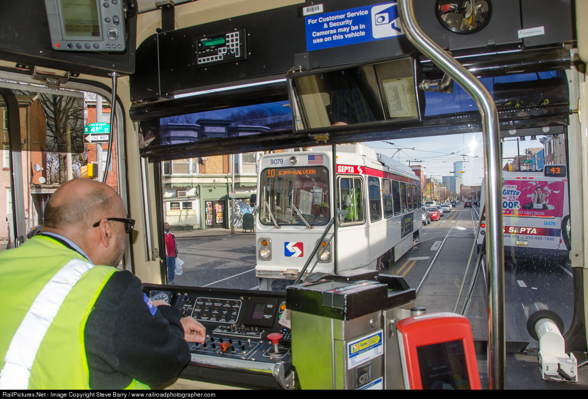 Operator Russell Greco watches from a SEPTA Kawasaki LRV as another LRV passes on SEPTA's Route 10.