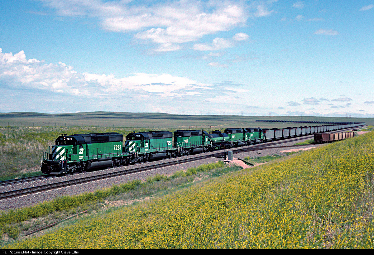 | 5 Burlington Northern SD40-2's 7223, 7258, 7248, 7227, 8163, with a fuel tender, go about there daily business in the Wyoming coal fields. |