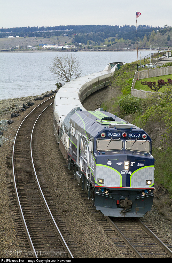 Southbound Amtrak Cascades Train 507, headed by the Seahawks-wrapped NPCU rounds the curve at Gordons Point along Puget Sound. While freight traffic will still use the picturesque water level route from Nisqually to Tacoma the time for passenger trains running along the sound is soon to be no more as a new overland cut-off is nearly ready to come into service.