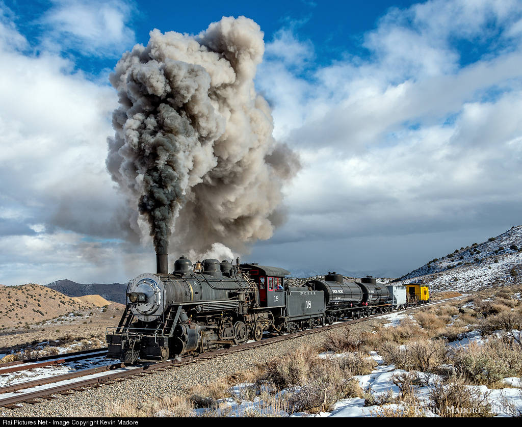 Hammering uphill at Scales. The former McCloud Railway #18 hammers uphill on the reconstructed Virginia City Line, passing the historic location of the station known as "Scales." In the early days of the V&T, loaded ore cars coming down from the mines at Gold Hill and Virginia City had to be weighed. The V&T located their "scales" at this site, because it was below the southernmost mine shaft in the region. By the late 1880s, the Scales had been moved further south to Moundhouse, but the name of the station stuck. For the rest of the history of the Virginia City Line, the station at Scales still held plenty of significance. It was the primary water stop for the locomotives, being roughly halfway between Carson City and Virginia City. It was also the home of a section crew that cared for this relatively remote section of track. Even today, there is still a siding at scales, and during the tourist season, the new V&T keeps an auxiliary water car here, just in case a passing train should need a top-off. For those who are into railroad archeology, the concrete footings of the old wooden water tank are still present at this location, and can be found amid the sagebrush, on the west side of the track....on the right side of this particular image.