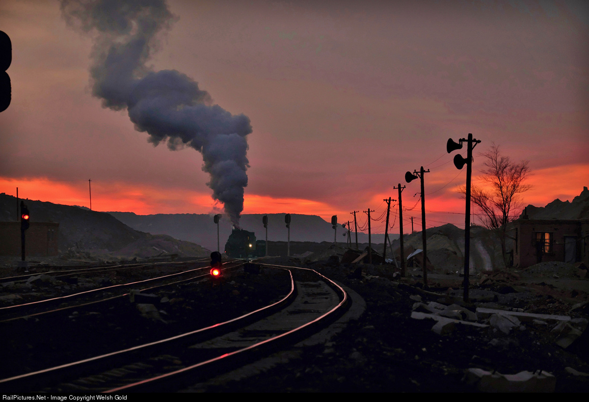 As the sun dips below the horizon, an unidentified JS Class locomotive having just loaded with coal, heads east destined for the wash plant along the now mined out eastern section of the open pit at SandaoLing, Xinjiang Province, northwest China.