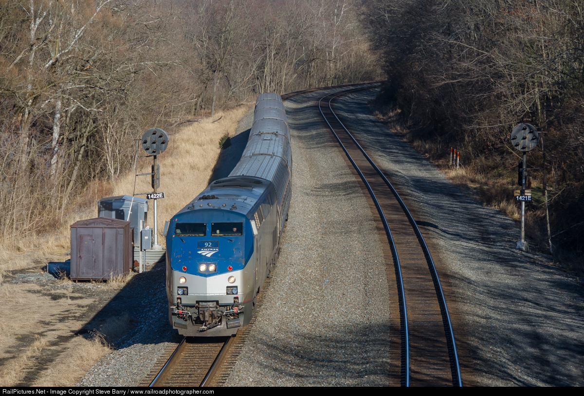 | Amtrak's westbound Pennsylvanian splits a pair of former Pennsylvania Railroad position light signals as it heads west towards Pittsburgh on the PRR's Middle Division. |