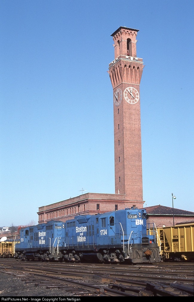 Since 1909, the 240-foot clock tower of the former New Haven Railroad station in Waterbury, CT, has been a local landmark. The tower was modeled after one in Siena, Italy, that had caught the attention of the NH's then president. These Boston & Maine GP9s were newcomers in town when photographed in 1982 following the B&M takeover of Conrail operations. Today, the station building has long been owned by the city's main newpaper, but Metro North commuter trains still stop out front.