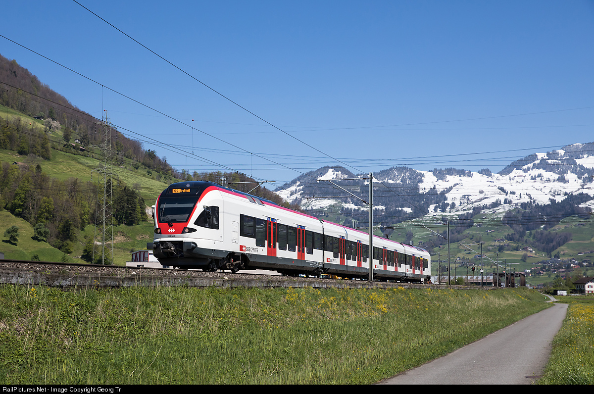 "Flirt" trainset RABe 523 # 062 of the SBB is running the S 2 service 21243 from Baar Lindenpark to Erstfeld, between Schwyz and Brunnen.