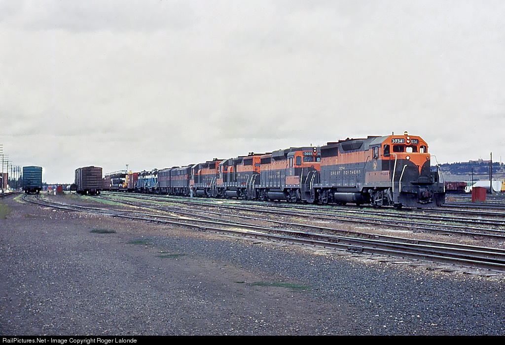 An interesting all Great Northern lash-up with in the lead GP35 no.3034, GP30, two GP35s, F3B, F3A and two Big Sky Blue GP9s are arriving Denver, Colorado on April 28, 1968. Photo from my collection, no photographer listed on slide.