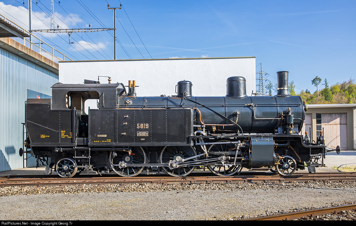 The 2-6-2 tank locomotive Eb 3/5 # 5819 was built in 1912 by SLM Winterthur for mixed traffic, has about 990 HP and can run max 75 km/h in both directions with her 1520 mm diameter driving wheels, so it needs no turntable. The "Habersack" is historic locomotive since 1985 and based in Brugg (AG).