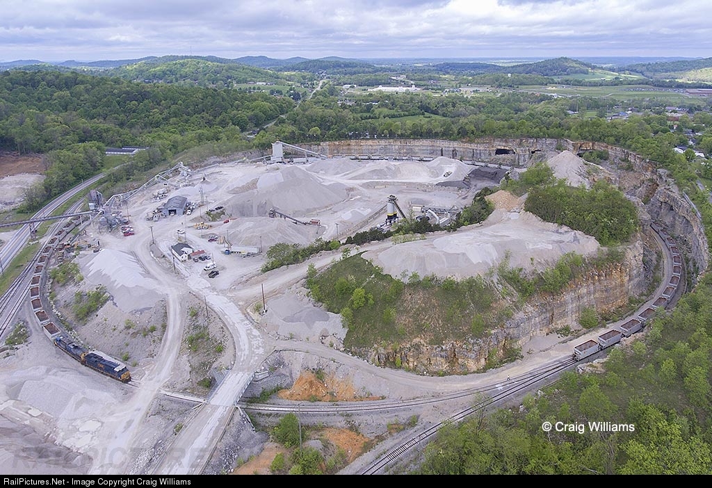 The CSXT has a limestone loader on the ex-L&N mainline west of Sinks, KY, off the CC Sub. The CSXT use 9 miles off this ex-mainline to access this loader on the west side of Mount Vernon. Here an empty pulls around the loop track to spot the train at the Hanson's Quarry. The CP at Sinks on the CC Sub is located 40 miles north of Corbin, KY. This view is from my drone which is prefect for this neat view.
