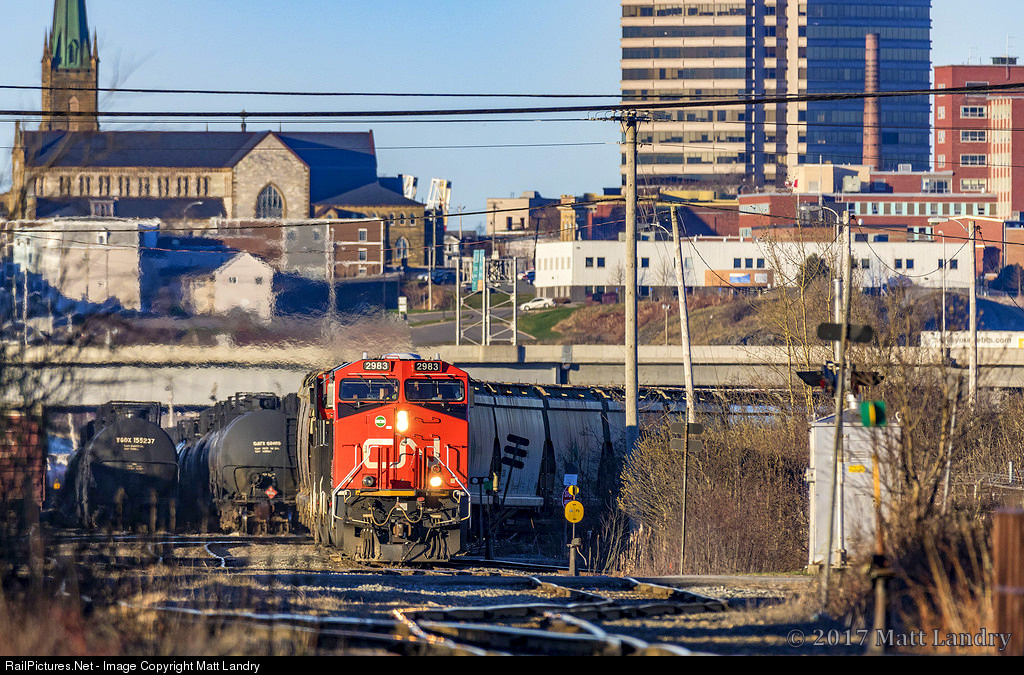 Shot At 600mm With part of the Saint John city skyline in view, CN 2983 leads a small empty potash train as they depart Saint John, destined for Moncton, New Brunswick. I love how close I can get with the 600mm lens. That overpass in the distance is about 6-7 miles away, but it seems pretty close!
