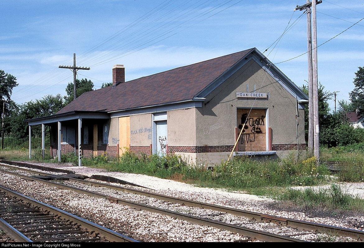 CNW's Oak Creek, WI depot is unused and in disrepair in September of 1986. Located on CNW's Old Line (the Milwaukee-Chicago passenger mainline), this was a busy location at one time with several large shippers in the area. Unfortunately, the shippers and the depot are gone today.