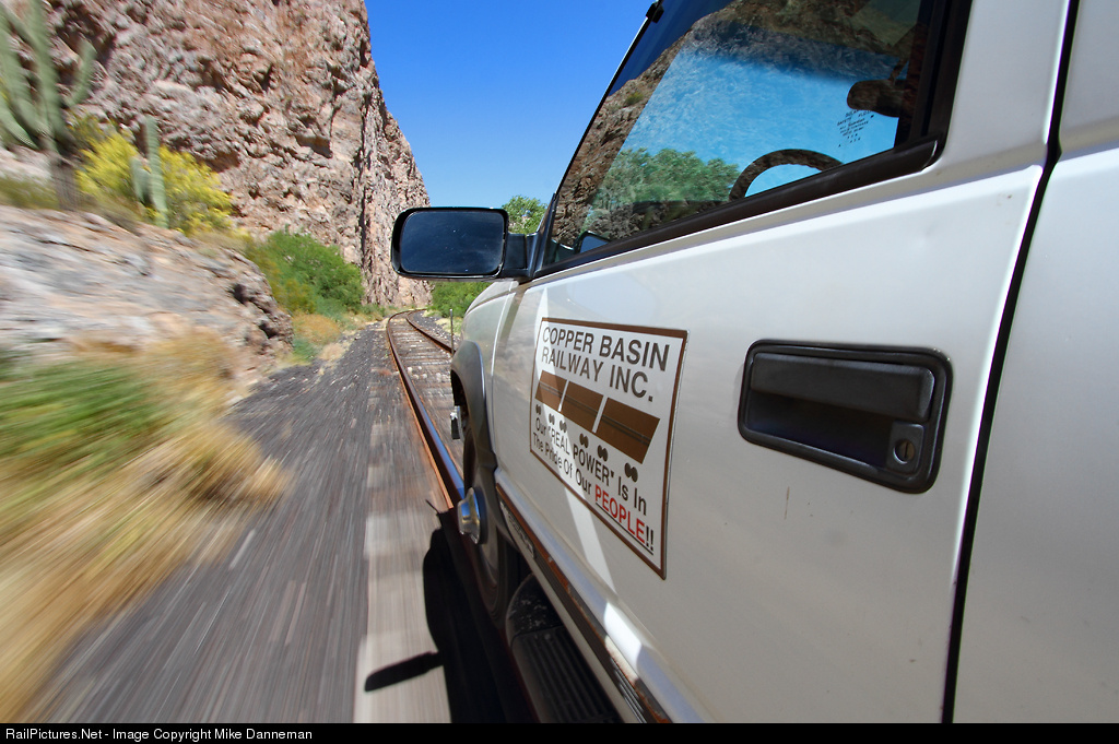 L.S. “Jake” Jacobson, President and Chief Operating Officer of Copper Basin Railway, inspects the main line to Florence and Magma between Price and Cochran, Arizona, using the company’s GMC Suburban hi-rail on April 21, 2017.