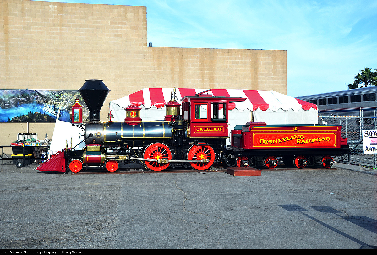 Disneyland Railroad 4-4-0 #1 was constructed as Santa Fe & Disneyland #1 in 1955 by WED, the Walt Disney Company formed to construct all those wonderful things for Walt’s theme parks. (W, E and D are, unsurprisingly, the initials of Walter Elias Disney.) Disneyland, just down the street from the Fullerton railroad station, usually trucks one of their locomotives up Harbor Boulevard for the city’s annual Fullerton Railroad Days festivities, and 2017’s exhibit is no different. Then again, the Disneyland Railroad is shut down, so this engine was “cold” anyway. (The railroad had to have its mainline relocated as part of the park’s expansion, which will consist primarily of the new Star Wars Land. The mural on the wall illustrates the new mainline.) Photographed on Cinco de Mayo 2017. Even though, with the coming on Amtrak, the Santa Fe was out of the passenger business, their sponsorship of the railroad at Disneyland continued until in October 1974, when the contract was up for renewal. There was some talk
