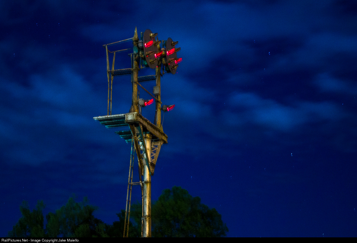 In the early morning hours of a cool spring day, the Norfolk & Western's signature CPL style signals stand guard at control point Dogwood, just outside of Altavista, displaying its 'stop' indication into the morning sky.