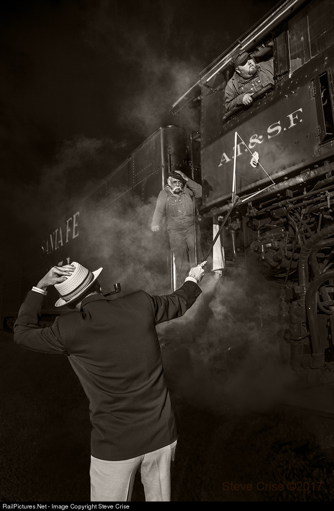 “Hooping up orders”, c. 1941. San Bernardino Railroad Historical Society volunteer’s Eric Smith, Sam Calderwod and Greg Casford ad drama to this scene that was part of a fund raising shoot for the San Bernardino Railroad Historical Society to help defray the costs to bring the 3751 to Fullerton Railroad Days event, which was held on May 5 & 6 2017. The SBRHS will soon begin the necessary repairs required by the Federal Railroad Administration to bring her into compliance with the one thousand four hundred seventy-two (1472) service day inspection. This process could take up to two years to complete. Your donations would be greatly appreciated. Please visit www.SBRHS.org to find out you can help keep her on the rails and running! - Steve Crise ©2017