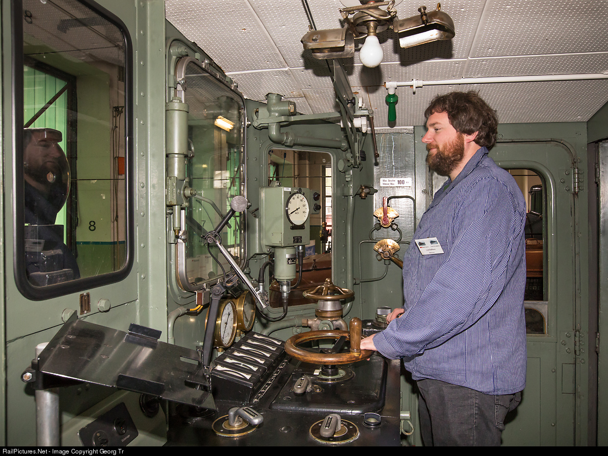 | Driver L.R. at the controls of electric locomotive Ae 4/7 # 10976 of SBB Historic, in the shed of Depot Erstfeld. The 2' Do 1' (4-8-2) express train locomotive with 2296 kW, Buchli single axle drive and max. velocity of 100 km/h was built by SLM and MFO in 1931 for the SBB and based at Lausanne for decades. After a revision R2 in december 1994 declared as historic locomotive, later based at St-Maurice. Now for about 18 months at Erstfeld Depot. |