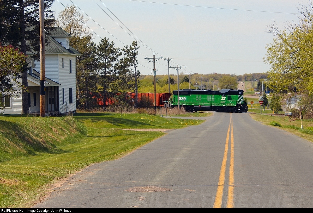 | Quaint Settings: Breaking the silence of a peaceful afternoon, a BN ballast train blasts through a rural crossing. Headed for another load of rock. Taken while off duty, wearing full PPE. |